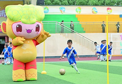 日前,在浙江省金华市秋滨小学,杭州亚运会吉祥物走进校园与学生足球队互动。金华市是杭州亚运会五个协办城市之一,将承办足球和藤球赛事。