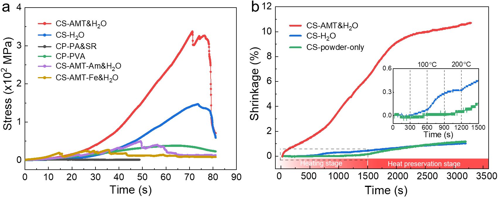 图4(a)不同冷烧结工艺和配方制备的复合材料的抗压曲线(b)冷烧结过程中的压缩曲线
