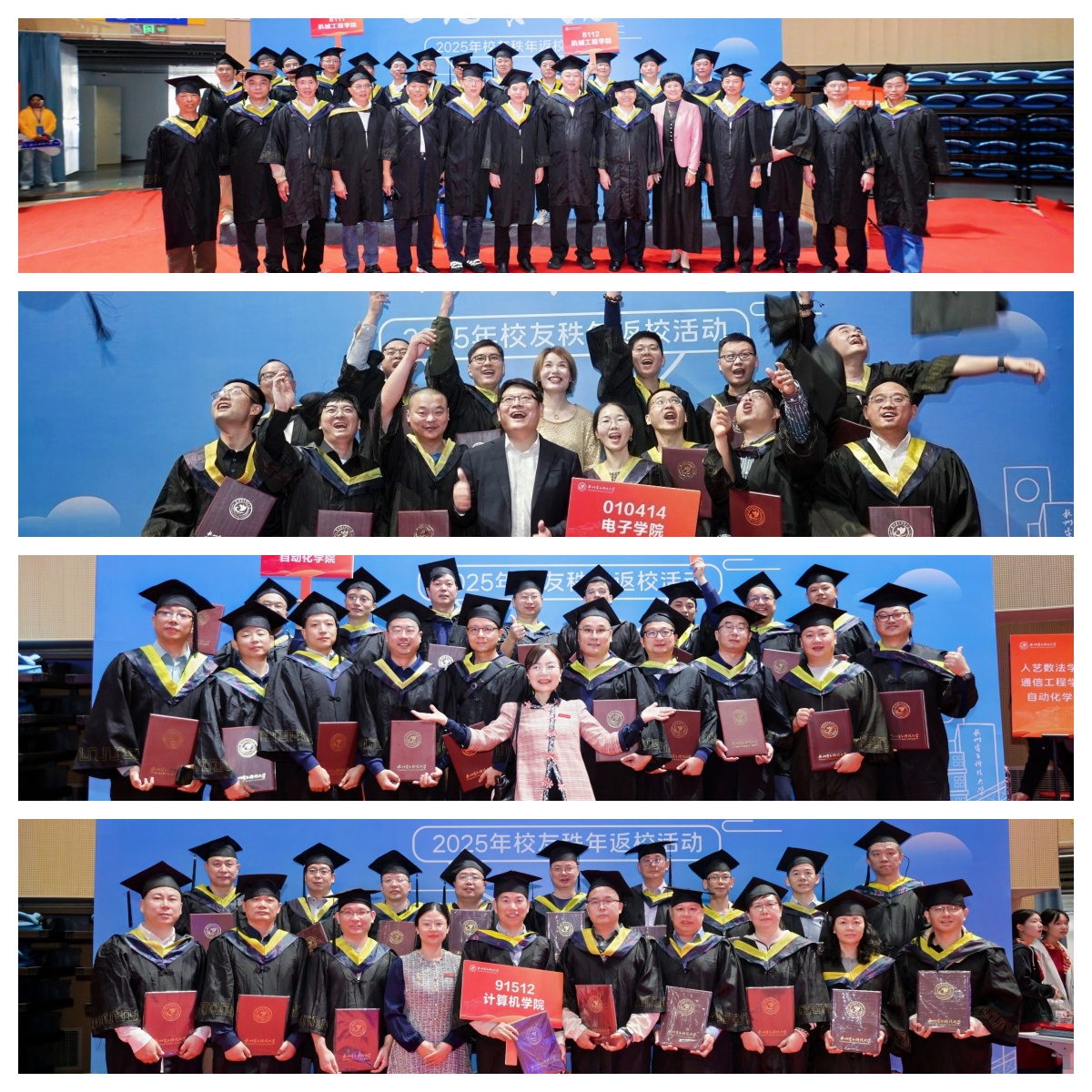 在重温毕业礼活动中,各学院负责人来到校友合影牌前,以班级为单位,为每一位远道归来的秩年校友颁发了精心制作的返校纪念证书。证书虽轻,情意厚重。校友们脸上洋溢着自豪与幸福的笑容,在镜头前定格下珍贵一刻。这张合影,不仅记录了今日重逢的欢颜,更将杭电大家庭的血脉深情永久珍藏。