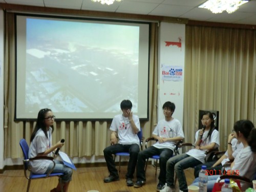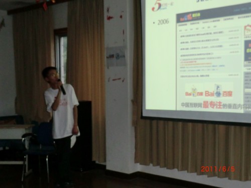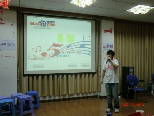 百度爱好者五周年庆典于6月5日下午18:30正式开始,在主持人介绍完到场嘉宾之后,大屏幕上开始播放来自团队内外的对百度爱好者网站的祝福之声。爱度杭电团前任队长余笃权带大家一起回顾了百度爱好者五年来的发展历程,现任队长陈斌介绍了现阶段爱度杭电团队的主要成员并表达了对百度爱好者网站五周年的深深祝福。