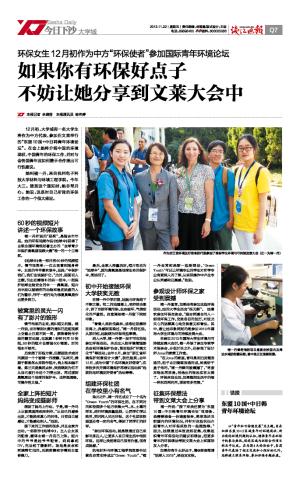 钱江晚报:环保女生12月初作为中方“环保使者”参加国际青年环境论坛,如果你有环保好点子,不妨让她分享到文莱大会中