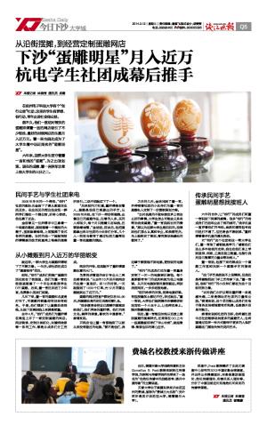 “后来细问才知道,董师傅是安徽人,蛋雕是他自己琢磨出的手艺,从2005年开始,在下沙一带沿街摆摊,出售自己的蛋雕作品,但看的人多,买的人却很少,每个月只能赚几百块钱,还要躲着城管。”金洁说,回去后,他把蛋雕拿出来与社团的小伙伴们分享,几个人一拍即合都有了通过社团力量帮助董一言买蛋雕的想法。