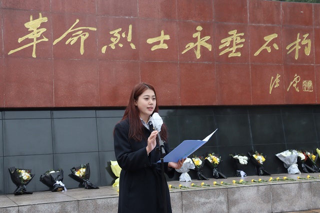 校党委副书记钱波缓步上前,仔细整理花篮缎带,并驻足凝视,表达对革命烈士最崇高的敬意。随后,机关党委党员代表和学生代表向烈士纪念碑三鞠躬。
