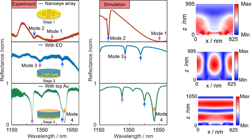 如图2所示,合作团队还利用模式分析方法,对等离激元超构表面的各个谐振模式进行理论分析和定量设计,最终通过合理的设计超构表面结构的周期和电光聚合物的厚度,能够在光通信O波段和S波段同时激发两个高Q值的谐振峰,为可调双波段的振幅型电光调制提供了设计思路。 测试结果表明,当施加±100 V直流偏压时,器件呈现出3 nm的光谱偏移和11 %的调制深度,并且当Vpp为18 V时,调制速率能够达到1 GHz,是目前已知集总电极式光纤电光调制器的最高调制速率。