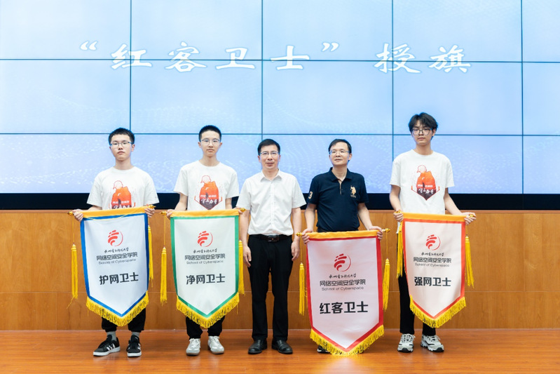 校党委副书记戚明钧为赛博协会指导老师王小军授“红客卫士”总队旗,钱塘区委宣传部常务副部长李安坤、钱塘区网警大队队长潘宏明、网络空间安全学院党委书记罗美华为红客卫士志愿者代表颁发志愿服务证书并为“净网卫士”“护网卫士”“强网卫士”授小队旗。