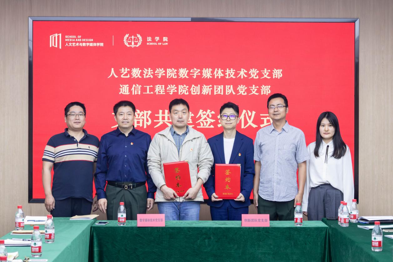 在与会人员的共同见证下,人艺数法学院数字媒体技术党支部书记尹学松、通信工程学院创新团队党支部副书记滕旭阳代表双方党支部签订了支部共建协议,双方就共建原则、共建内容和共建途径等方面互换意见、互通想法、达成共识。希望今后两个支部以本次支部共建活动为契机,开展理论联学、活动联办、业务联抓、难题联解和成果联传,实现党组织优势互补,携手并进,进一步增强组织力和战斗力,助力学校和学院的高质量发展。