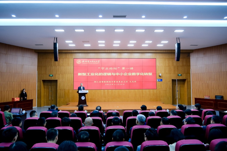 11月15日下午,学校“守正论坛”正式启动。浙江省原副省长、国家智能制造专家委员会委员、浙江省智能制造专家委员会主任毛光烈应邀以“新型工业化的逻辑与中小企业数字化转型”为题作“守正论坛”第一讲。学校领导、中层领导人员、科级干部、教师身份党支部书记、组织员和教师代表等350多人聆听报告。论坛由校党委书记王兴杰主持。
