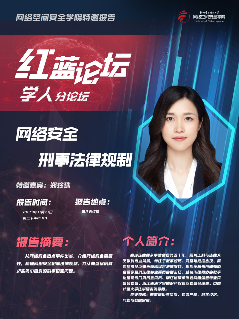11月21日,在科技馆第八会议室,网络空间安全学院信息安全党支部邀请北京安理(杭州)律师事务所合伙人郑玲珠律师做客“红蓝论坛”,为大家带来一场名为“网络安全刑事法律规制”的主题报告。本次论坛邀请了学院党委副书记、纪委书记苏晶出席,会议由学院副院长吴国华主持,北京安理(杭州)律师事务所党支部、网络空间安全学院信息安全党支部和研究生党支部全体党员以及2023级研究生参加此次论坛。