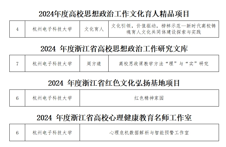 我校思想政治工作再添硕果!近日,省教育厅公布了2024年度高校思想政治工作质量提升综合改革与精品建设项目等立项结果,我校4个项目获得立项。其中,《文化引领,价值驱动,榜样示范—新时代高校铸魂育人文化共同体建设探索与实践》入选省高校思想政治工作精品项目并拟推荐教育部,“红色精神家园”入选省红色文化弘扬基地项目;《高校思政课教学方法“理”与“实”研究》入选省高校思想政治工作研究文库;“心理危机数据解析与智能预警工作室”入选省高校心理健康教育名师工作室。