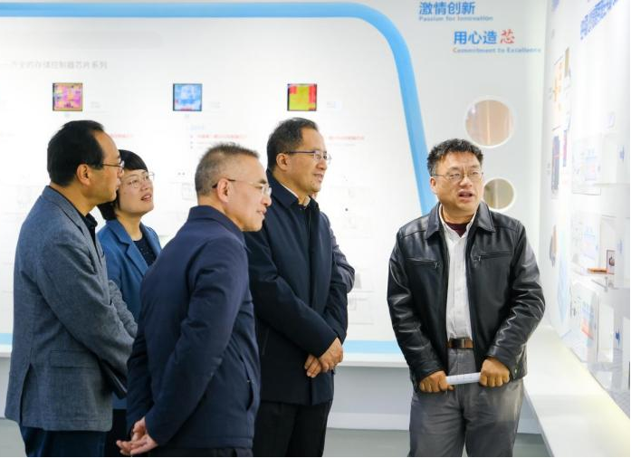 调研期间,张学伟一行考察了我校微电子研究院,详细了解研究院在存储控制器芯片领域的研究成果和科技创新等情况。他充分肯定学校依托电子信息特色学科优势,聚焦国家重大战略需求,着力打造高能级科技创新平台所取得的成效。