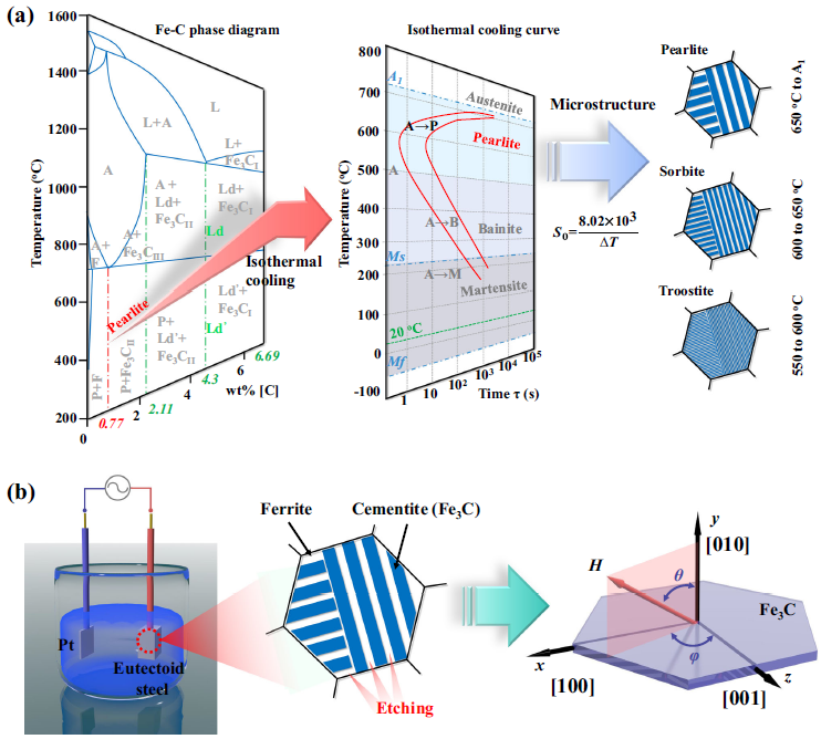 图1. Fe3C微米片制备工艺示意图。(a)Fe-C二元相图和共析钢等温淬火曲线。通过控制等温淬火温度分别获得了珠光体、索氏体和屈氏体。白色和蓝色条纹分别表示铁素体和渗碳体(Fe3C)。其中,A表示奥氏体,B表示贝氏体,F表示铁素体,L表示液相,Ld/Ld’表示莱氏体,M表示马氏体,P表示珠光体,Mf表示马氏体转变结束温度,Ms表示马氏体开始转变温度,S0表示平均层间距。(b)电化学腐蚀去合金化过程示意图。在此过程中白色的铁素体被腐蚀后获得片状Fe3C。