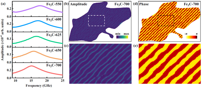 图5.微磁学模拟Fe3C微米片的铁磁共振行为。(a)模拟获得的不同等温淬火温度下Fe3C微米片的复磁导率虚部。(b) 700℃等温淬火获得的Fe3C微米片中振幅分布图(15.1 GHz)及(c)白色线框的局部放大图。(d) 700℃等温淬火获得的Fe3C微米片中相位分布图(15.1 GHz)及(c)白色线框的局部放大图。