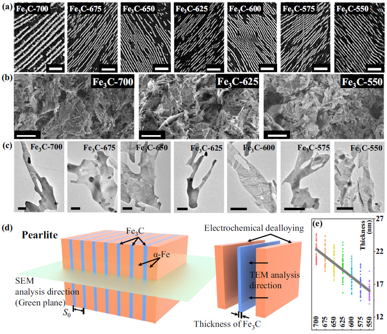 图2. 微结构表征。(a)共析钢在不同温度下等温淬火后的SEM图像,标尺为2 mm。分别在不同温度下等温淬火后获得的Fe3C微米片(b)SEM图像和(c)TEM图像,标尺分别为10 mm和1 mm。(d)制备工艺示意图。(a)珠光体微结构及其电化学腐蚀去合金化示意图。(e)不同等温淬火温度下的Fe3C微米片厚度统计。