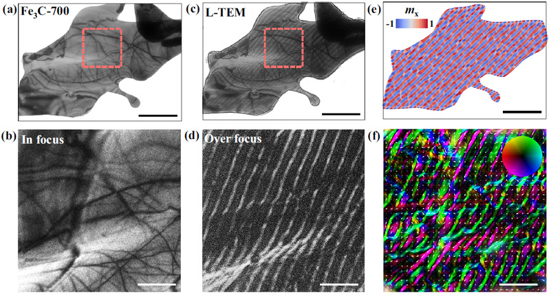 图4. 700℃等温淬火获得的Fe3C微米片的L-TEM表征。(a)正焦L-TEM图像和(b)红色框区域的局部放大图,标尺为500 nm。(c)过焦L-TEM图像和(d)红色框区域的局部放大图,标尺分别为2 mm和500 nm。(e)微磁学模拟获得的磁化方向分布图,颜色表示x方向的磁化分量,标尺为2 mm。(f)TIE方法获得的磁化方向分布图,颜色表示平面内磁化方向,标尺为500 nm。