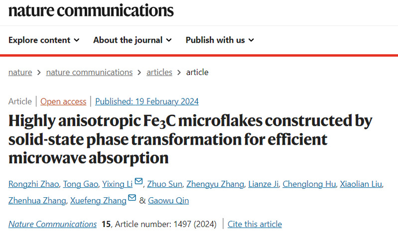 近日,Nature Communications在线刊登了久久精品一区二区材料与环境工程学院张雪峰教授团队的研究论文“Highly anisotropic Fe3C microflakes constructed by solid-state phase transformation for efficient microwave absorption”。该工作利用电化学腐蚀去合金化方法从传统共析钢中获得了磁性Fe3C微米片,通过控制等温淬火温度诱导固态相变调控磁性Fe3C微米片的各向异性,并展现出了优异的吸波性能,实现了传统结构材料的功能化应用。