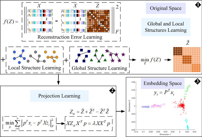 随着智能设备和信息技术的快速发展和应用,产生大量的高维数据。传统方法在处理这些高维数据时往往失效。维数约简是有效解决“维数灾难”的重要技术之一。现有主流的维数约简方法或者依赖全局结构,或者依赖局部结构,无法学习到具有判别力的投影。为了解决这个问题,本论文提出了一种新的无监督降维算法,称为结构感知保持投影(SAPP)。SAPP有效集成子空间聚类和结构图学习捕获数据的内在几何结构。一方面,通过构造最近邻图和分组功效,SAPP可以更好地捕获数据的局部结构;另一方面,将最小二乘回归(LSR)引入到子空间学习中,既建模了全局相关结构,又保持了数据点之间的亲和关系,从而找到一个判别力更强的投影方向(图1)。