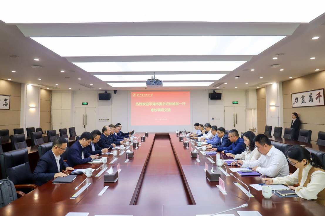 5月9日上午,平湖市委书记仲旭东,市委常委、常务副市长戴振一行来我校调研,就双方加强合作事宜展开交流。校党委书记吴卿主持座谈。副校长李文钧,相关职能部门和学院负责人参加座谈会。