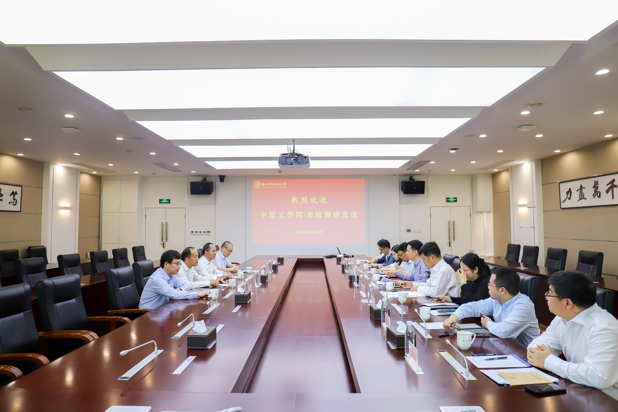 贾少鑫对杭电的帮助支持表示衷心感谢。他说,杭电是电子信息特色强校,在诸多方面极具竞争力,中原工学院筹建河南电子科技大学的进程中,迫切需要杭电的帮助支持, 以促进中原工学院各项事业高质量发展。夏元清表示,希望学习借鉴杭电在内涵建设方面的先进经验和做法,加强两校在人才培养、学科建设、科学研究、学术交流、教师互派等方面的合作,共同为国家培养更多优秀人才。