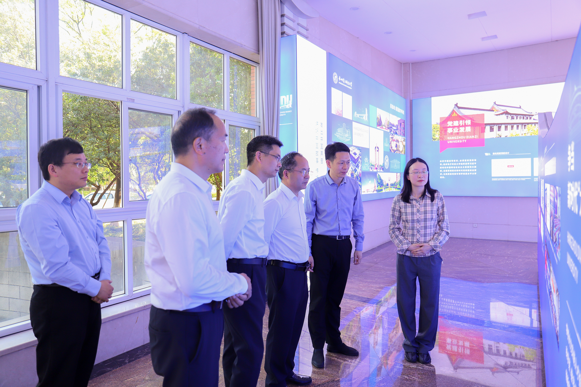 座谈会前,贾少鑫、夏元清一行在我校党委书记吴卿、校长陈积明、副校长马国进等陪同下,参观了学校“在杭电看见数字科技”成果展。