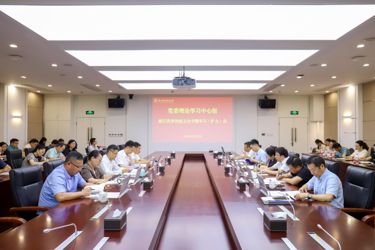 6月19日下午,校党委理论学习中心组举行浙江优秀传统文化专题学习(扩大)会,围绕传承发展浙江优秀传统文化展开学习研讨。校党委书记吴卿主持会议并作讲话,校党委理论学习中心组成员、各二级党组织书记、党群部门负责人参会。