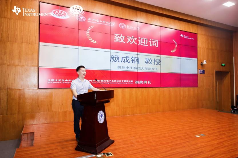 我校副校长颜成钢出席颁奖典礼并致辞。颜成钢对参赛师生表示热烈欢迎,并赞扬了学校在此次竞赛中的组织工作。他指出我校承办此次赛事,不仅是对办学实力的肯定,更是对广大师生积极参与创新实践、勇于挑战自我精神的高度认可。我们期待通过此类赛事,进一步推动电子信息类专业的教学改革与创新,培养更多具有实践能力和创新精神的优秀人才。