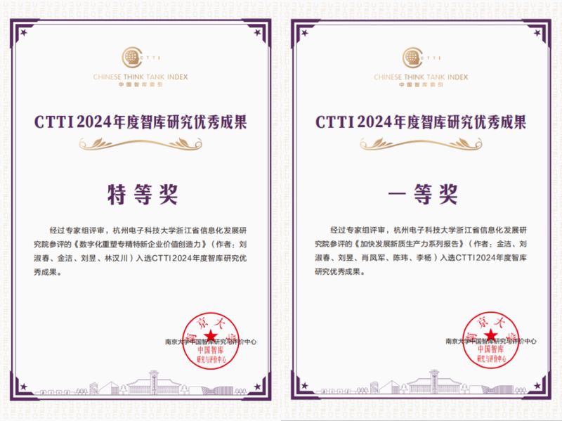 由南京大学和兰州大学共同主办的“2024新型智库治理论坛”在兰州大学召开。论坛发布了“2024年度CTTI智库研究优秀成果”。我校浙江省信息化发展研究院的研究成果《数字化重塑专精特新企业价值创造力》获评2024年度CTTI智库研究优秀成果特等奖,《加快发展新质生产力系列报告》获评2024年度CTTI智库研究优秀成果一等奖。