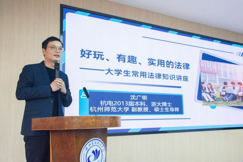 杭州师范大学沈钧儒法学院副教授、硕士生导师沈广明做主题讲座,以 “好玩、有趣、实用” 为主题,用幽默生动的语言,结合法律法条与生活中的具体案例,深入浅出地讲解了日常法律知识。问答环节中,师生们进行了热烈讨论。
