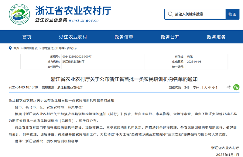近日,浙江省农业农村厅发布《关于公布浙江省首批一类农民培训机构名单的通知》(浙农字函〔2025〕94号),经过严格筛选与综合评估,全省共75家机构获此殊荣,我校凭借信息技术学科优势和社会服务能力成功入选。
