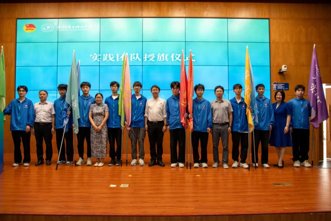 仪式上,葛红敏,学生处、教务处、后勤服务中心、马克思主义学院相关负责人向今年参加暑期社会实践理论普及宣讲团、党史学习教育团、乡村振兴促进团、发展成就观察团、民族团结实践团、共同富裕实践团、生态文明实践团、文明新风实践团、美丽浙江实践团、反邪教宣传实践团10大主题实践的学生代表授旗。